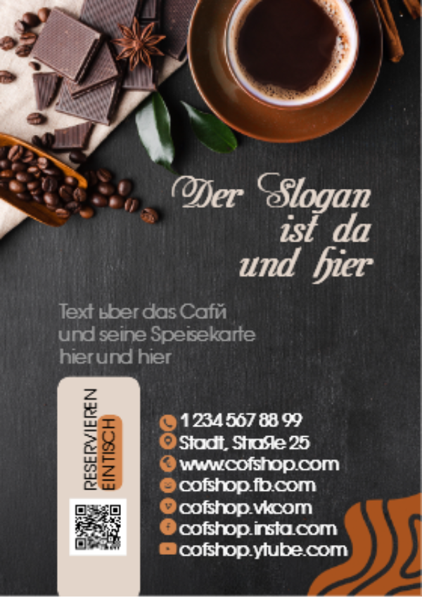 Vorlage A7. Titelleiste: Coffee-Shop A7-Flayer-Vorlage. Thema: Cafés, Bars, Restaurants