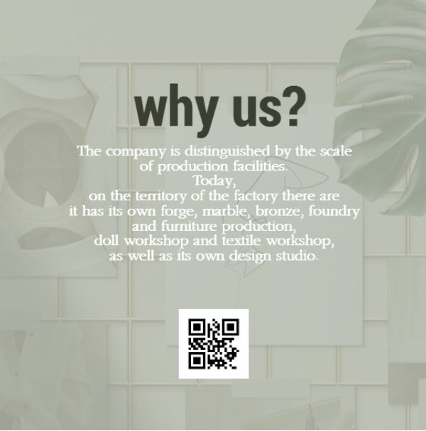 • The company is distinguished by the scale of production facilities. Today, on the territory of the factory there are it has its own forge, marble, bronze, foundry and furniture production, doll workshop and textile workshop, as well as its own design studio.