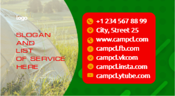 • +1 234 567 88 99 City, Street 25 www.campcl.com campcl.fb.com campcl.vkcom campcl.insta.com campcl.ytube.com