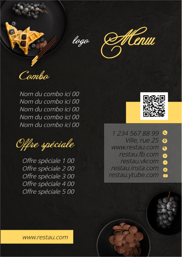 • 1 234 567 88 99 Ville, rue 25 www.restau.com restau.fb.com restau.vkcom restau.insta.com restau.ytube.com