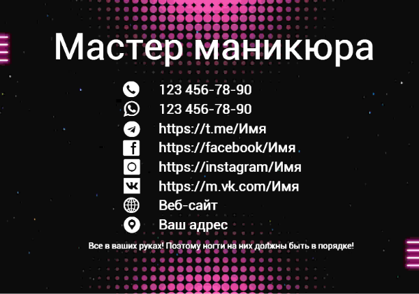 • 123 456-78-90 123 456-78-90 https://t.me/Имя https://facebook/Имя https://instagram/Имя https://m.vk.com/Имя Веб-сайт Ваш адрес